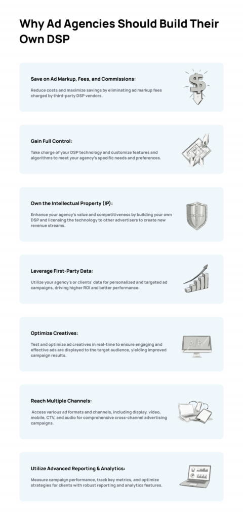 - Building a DSP allows agencies to save on ad markup, gain complete control over the technology and product roadmap, and own intellectual property.