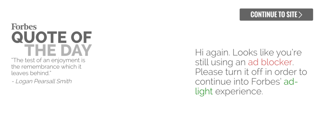 One specific example of this is Forbes. The premium publisher has chosen not to take the all-out, strong arm approach, instead building a user experience that features a sort of “landing-page” before page content is loaded. For non ad blocking users, this page usually features a relevant quote from a person of note, before redirecting visitors to the content they have chosen.