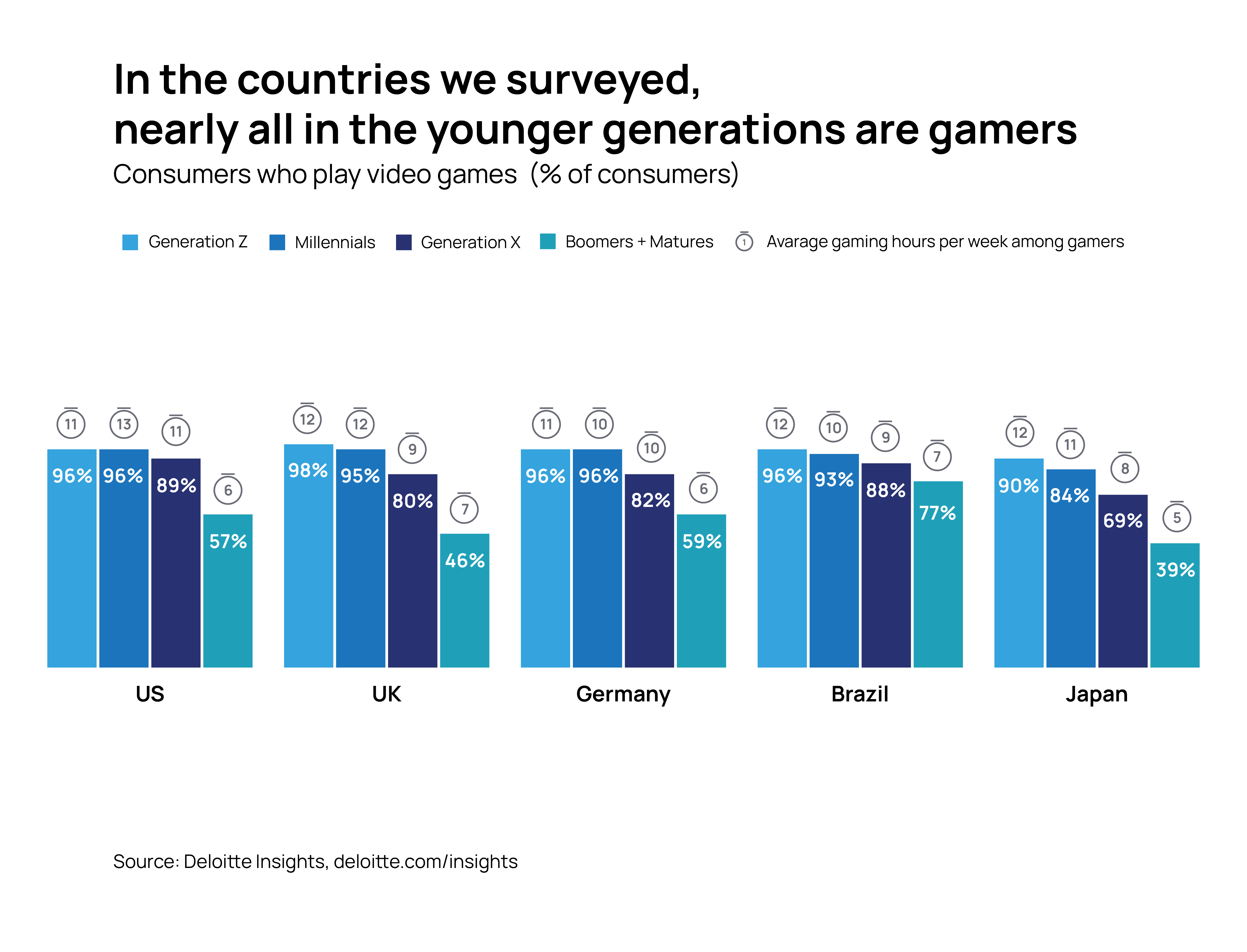Many may think that the gaming audience consists mainly of young people, however, the Deloitte media survey conducted in 2022 reports that gamers are spread across generations. In fact, on average, Gen Z and Millennials spend 11 hours per week playing video games.