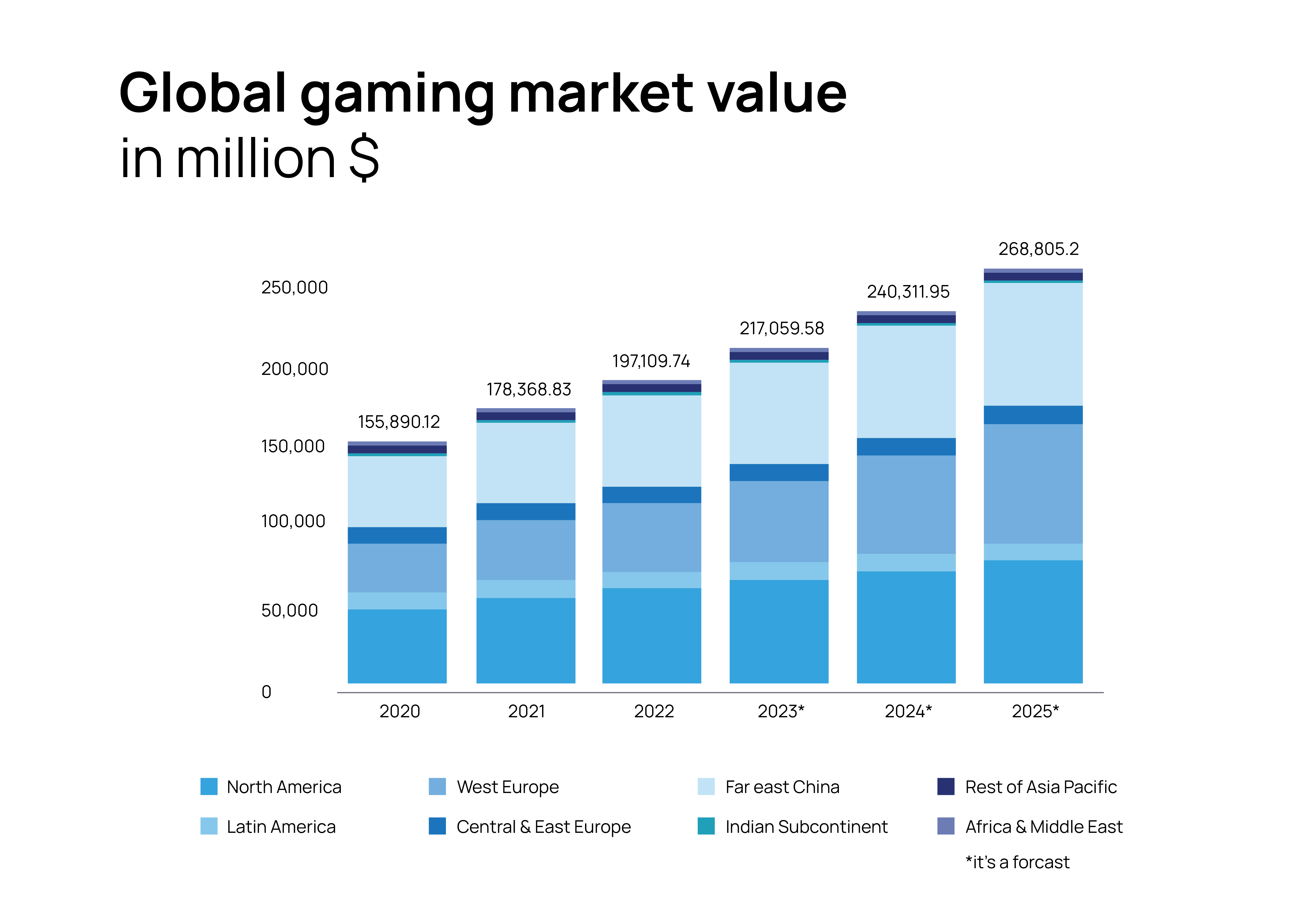 According to Statista, the global gaming market is expected to grow by 53% from $155 billion in 2020 to $268 billion in 2025.