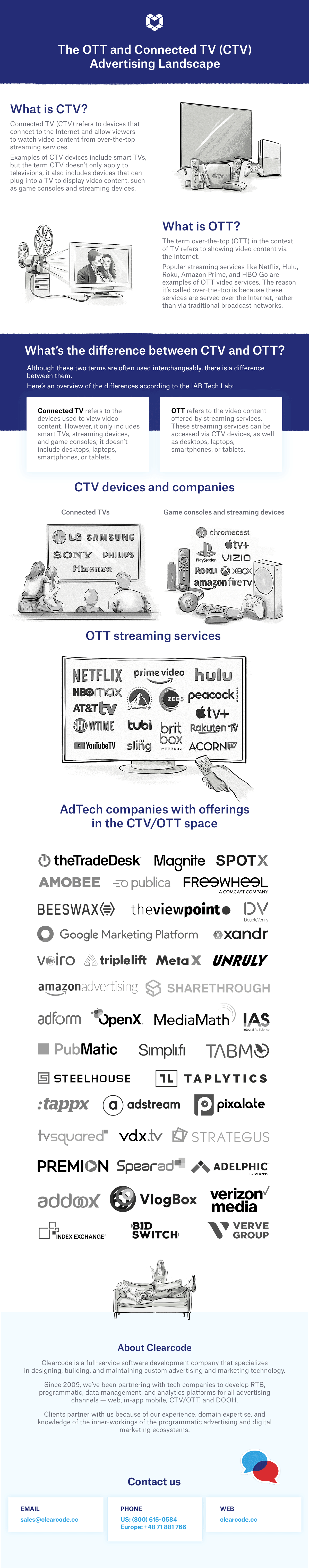 The CTV/OTT advertising landscape is made up of connected TVs (CTVs) and devices, OTT streaming services, and AdTech companies.