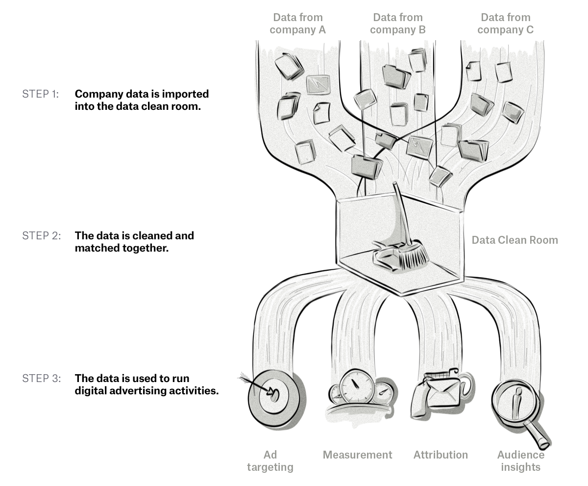 A data clean room is a piece of software that allows brands and advertisers to run targeted advertising campaigns, apply frequency capping, measure and report on the performance of campaigns, and run attribution — all in a privacy-friendly way. They can achieve this by uploading their first-party data and comparing it to the aggregate data in the data clean room, which has also been added by other companies.