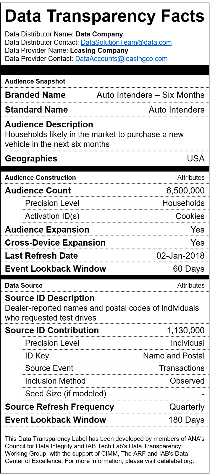 The Data Transparency Label is a labelling system used by AdTech vendors to easily state the quality of the data they sell. The labels declare information to advertisers about the origins of the data, how it was collected, whether it was manipulated, plus other pieces of information. Each field aims to give marketers, agencies and publishers a clear summary of the data segments and provide a common taxonomy for the advertising industry.
